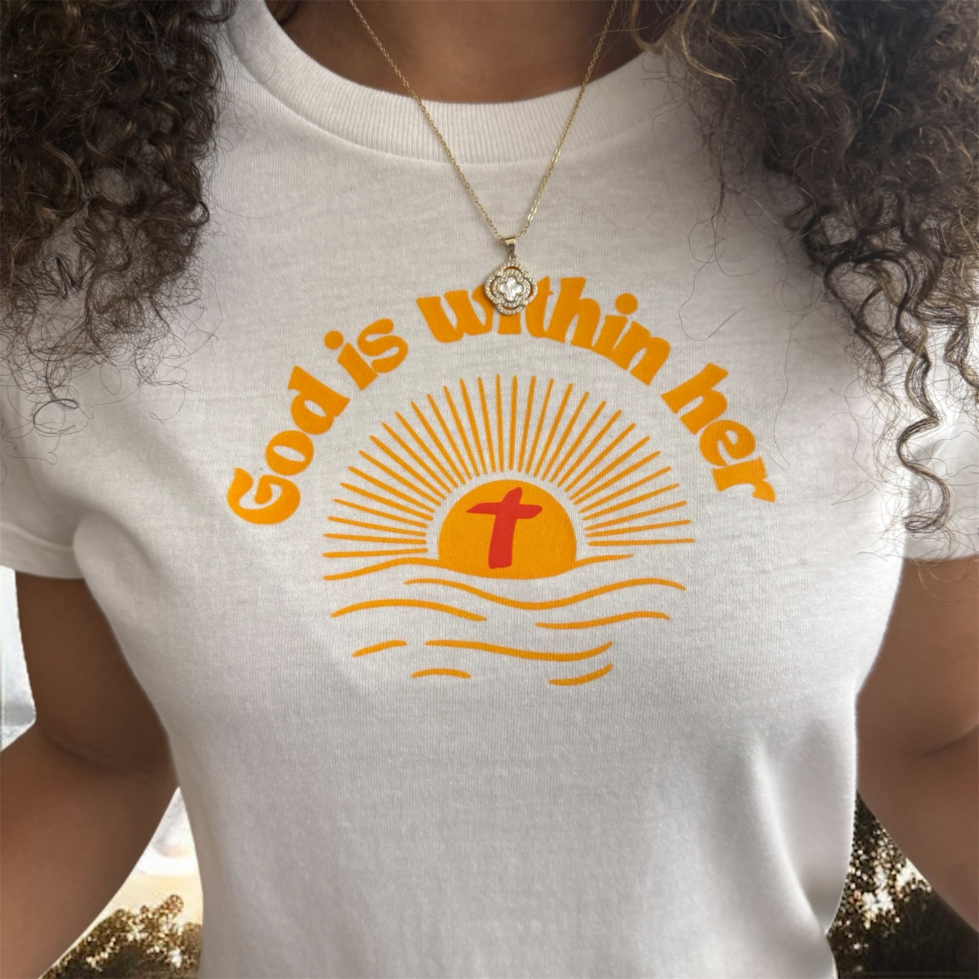 The God Is Within Her tee symbolizes divine confidence — the kind that stays calm in chaos, stands tall in trials, and shines with unshakable peace. It’s more than apparel; it’s a statement of faith and identity for every woman walking in purpose and grace.
